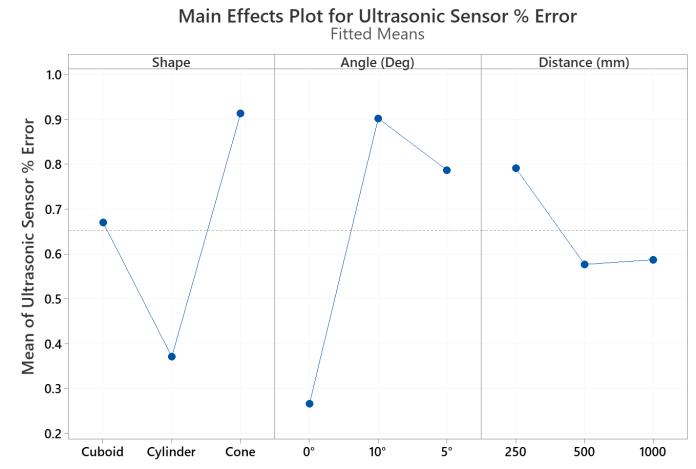 The graph in Fig. 13 shows that an ultrasonic sensor has minimummeasurementerrorforcylindershapeobjects,0° angle and a distance value of 500 mm. It has maximum measurementerrorforconeshapeobjects,10°anglevalue anddistancevalueof250mm,respectively.