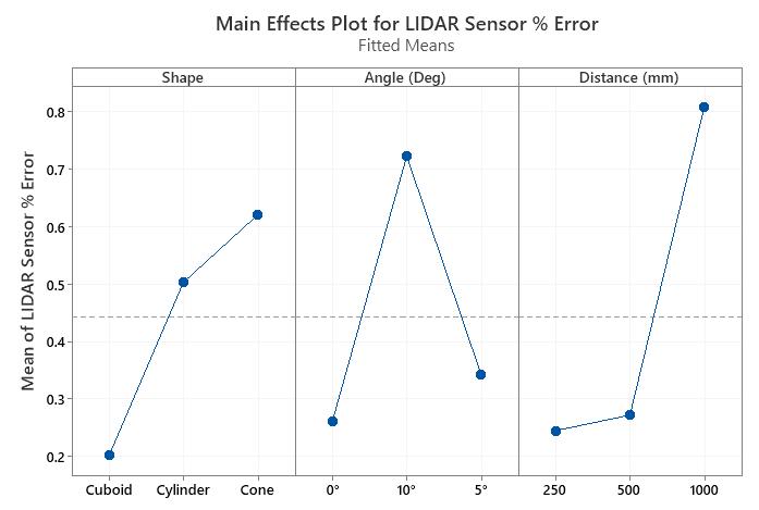 Abstract Autonomous Vehicles are sharply gaining popularity in the engineering and technology sector. This study aims to optimise the distance measurement of an Autonomous Vehicle using an ultrasonic sensor and LIDAR sensor for education purposes. An experiment is performedto find an indoor operating range of an ultrasonic and LIDAR sensor. In addition, Full Factorial design is used to experimentally find the effect of angle, distance and object shape on the sensor measurement error rate and the object detectionrate.Theresultshowsthatanultrasonic andLIDAR sensor has indoor operating ranges different from the manufacturer’s specifications. Both sensors are sensitive to angle, distance and object shape. It is concluded that the ultrasonic and LIDAR sensor has indoor operating ranges of 2000 mm and 250 mm. The ultrasonic sensor has minimum measurement error for cylinder shape objects, 0° angle and a distance value of 500 mm. It has a maximum object detection rate for cuboid shape objects, an angle value of 0° and a distance value of 500 mm, respectively. LIDAR sensor has a minimum measurement error for cuboid shape objects, 0° angle and a distance value of 250 mm. It has a maximum object detection rate for cuboid shape objects,0° angle value and distance value of 250 mm, respectively.