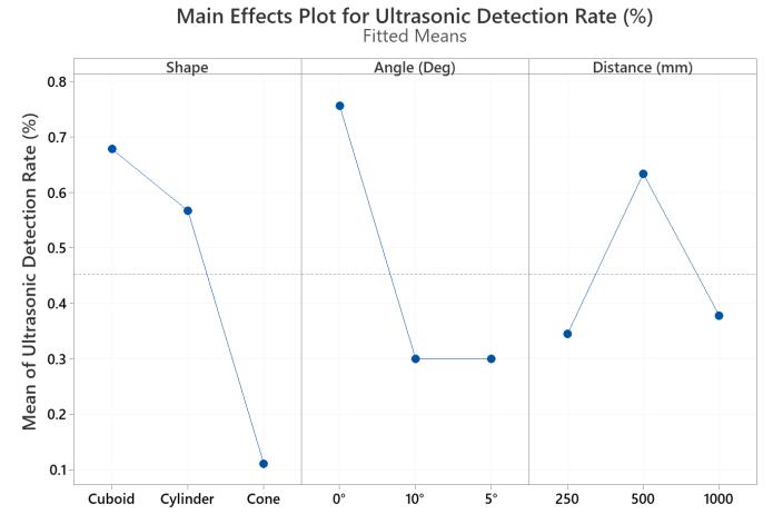 ThegraphinFig.17showsthatinanultrasonicsensor,to maximise the object detection rate and minimise the measurementerrorrate,theoptimalsettingsareanobjectof cuboidshape,anglevalueof0°anddistancevalueof500mm, respectively.