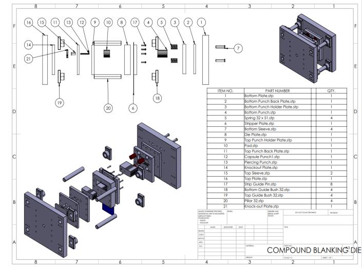 The compound die can be separated into two assembles, namelythetopassemblyandthebottomassembly.Thetop assembly consists of top plate, knockout plate, top punch back plate, die plate, punch plate, buffer pad and most importantly,thetoppunchesi.e.,piercingpunchandcapsule punch. The bottom assembly consists of the stripper, stripperplate,blankingpunch,bottompunchholder,bottom backplates,bottomplateandsprings.Theguidepillarsand guide bush help in the proper orientation of both the assembliesandensureproperworkingofthecompounddie soastogettheexactrequiredproduct.