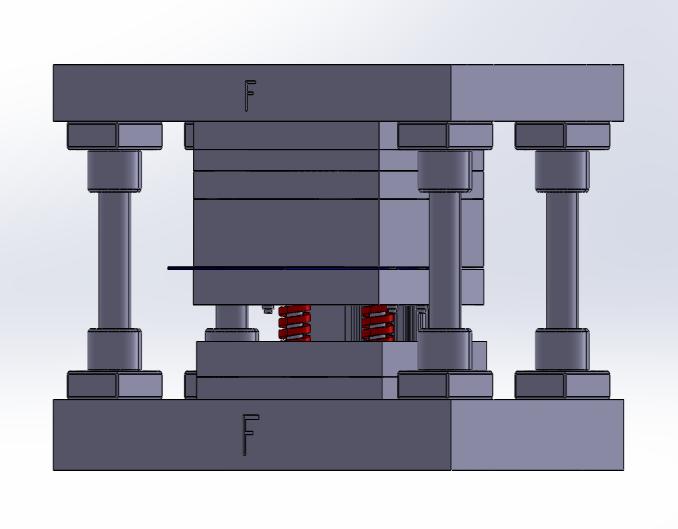 Fig 2 depicts the die as it appears during the operation, wherethetopassemblyandbottomassemblyisincontact with each other and the operation of piercing by the top punches and blanking by the bottom punchestakes place. The top assembly is in motion, on which the press ram