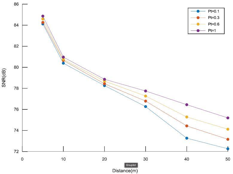 The Distance is taken from 0 to 50 m. The least value of SNRisobservedatthedistanceof50m. Thehighestvalue ofSNRisobservedatthedistanceof5m.