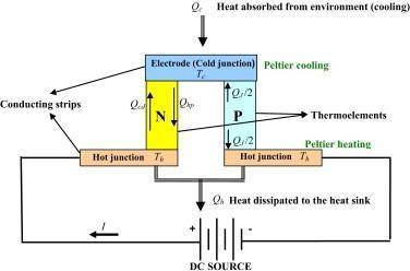 ThePeltiereffectisusedinthermoelectriccoolingtoproduce aheatfluxattheintersectionoftwodistinctmaterialtypes.A Peltiercooler,heater,orthermoelectricheatpumpisa solid stateactiveheatpump in whichheat istransferred fromone side of the device to the other while using electrical energy. Peltier devices, Peltier heat pumps, solid state refrigerators, thermoelectric coolers (TEC), and thermoelectric batteries are various names for the same device. It may be used for both heating and cooling, while cooling is the most widely used application. It may also be used to adjust the temperatureofaroom,eitherbyheatingorcooling.
