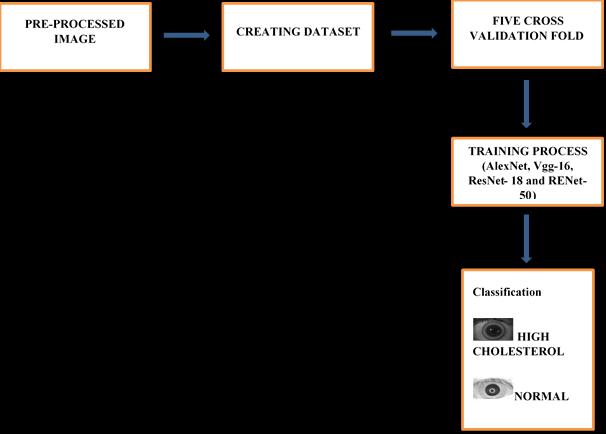 Sruthi K et al. [13] in their study developed a 33 layer Convolutional Neural Network (CNN) to classify images amonghealthy,riskofcholesterolandhighcholesterollevel. The CNN based classification system obtained accuracy of 100%,99.21%and100%forhealthy,riskofcholesteroland highcholesterollevel,respectively.