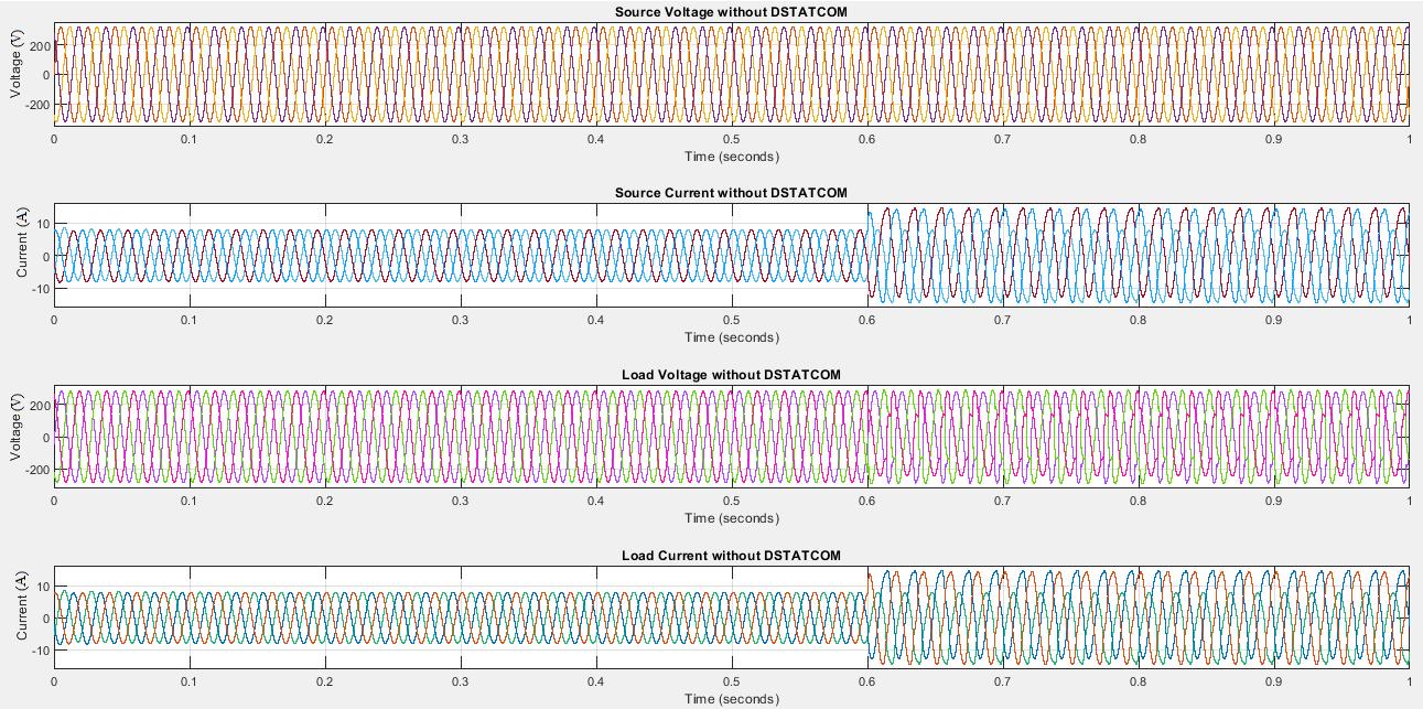 The load voltage and current waveforms without DSTATCOM are provided in figure 5 along with the source voltage and current