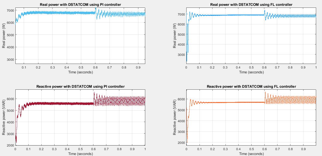Therealpowerisaround6.8KWandreactivepowerisaround5.8KVARwhenDSTATCOMusingPIcontrollerisemployed. Therealpowerisaround6.9KWandreactivepowerisaround5.7KVARwhenDSTATCOMusingFLcontrollerisused Due totheunbalancedloadconnectedatt=0.6s,thereareripplespresentinbothrealandreactivepowerforDSTATCOMusing PIcontrolleraswellasFLcontroller.