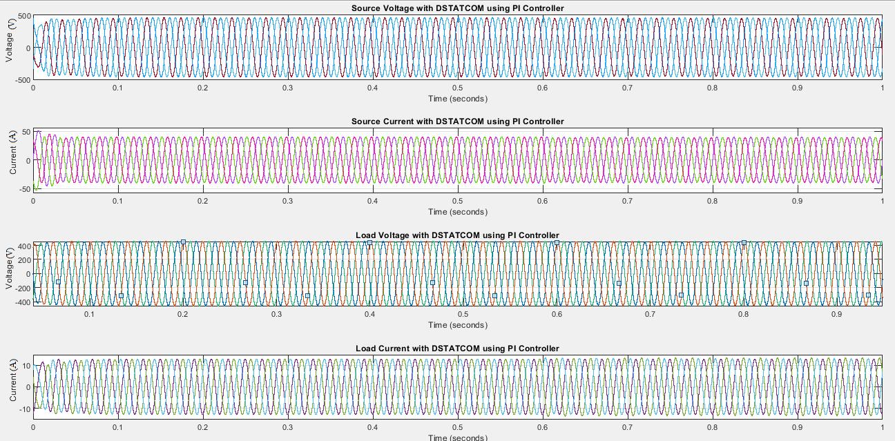 Fig7 WaveformsforsourcevoltageandcurrentalongwithloadvoltageandcurrentwithDSTATCOMusingPIController