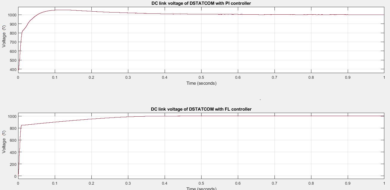 The DC link voltage of DSTATCOM is provided in Fig 10 For both the PI controller as well as FL controller, the DC link voltage is around 1KV as the reference dc voltage is provided as 1KV. Here the overshoots in FL controller are removed comparedtoPIcontrollerwherethepeakovershootisaround1053V.