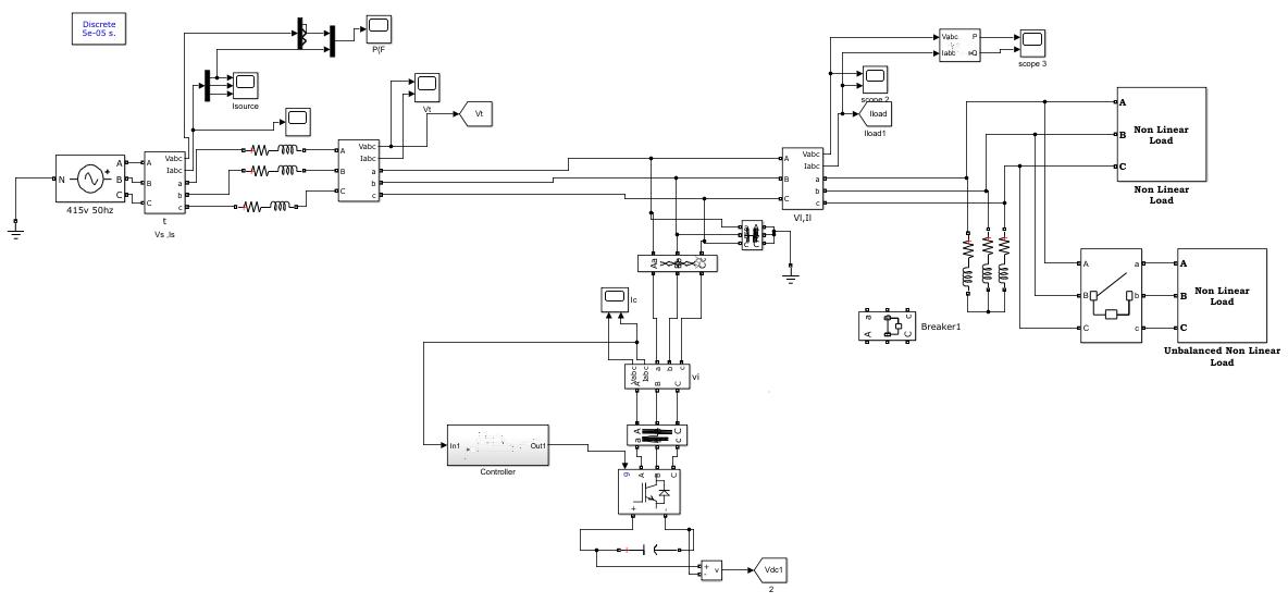 In this, the DSTATCOM is connected to the base system through coupling transformer of power 5000VA, voltage of 450V/450V.AnRLCfilterisalsoconnectedinbetweenthePointofCommonCoupling(PCC)andVoltageSourceConverter (VSC)device.