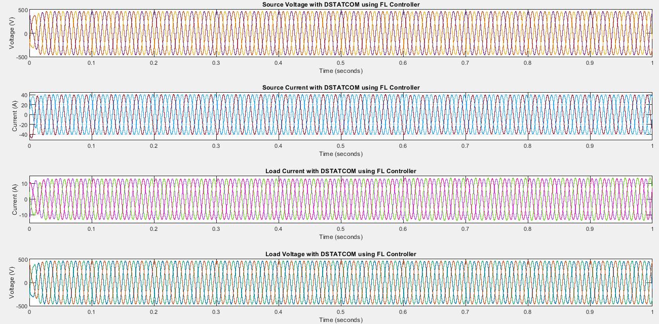 underthesecontrollersarepresented ThePIcontrollerbasedDSTATCOMgivesbetterpowerfactorcorrectionand%THD is reduced from 10.50 to 4.06 and also the load voltage is regulated. The FL controller improves the performance by reducingthepoweroscillationsandimprovesthepowerinjectionbyreducingthe overshootin DC link voltage.Itbrings downthe%THDto2.11fromtheinitialvalueof10.50. The%THDisfoundtobemuchimprovedwithFLcomparedtoPI controller.
