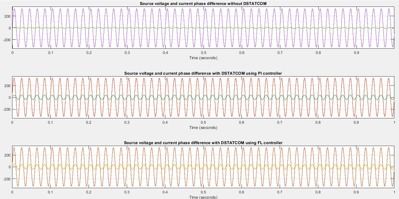 The difference in phase angle between voltage and current is 48.6 degrees (0.0027s in terms of time period) in the base systemwithoutDSTATCOM.Onusing thePIcontroller,thedifferenceinphaseanglebetweenvoltageandcurrentiszero degrees (0s in terms of time period) i.e., both voltage and current are in phase with each other. Similar waveforms are observedwhenFLcontrollerisusedintheDSTATCOM.Thiscanbeseeninthefigure9.