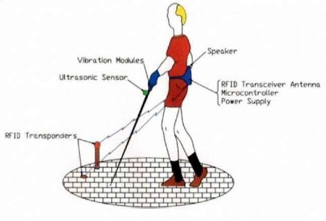 TheUniversityofMichiganisworkingonthecreationofasophisticatedcomputerizedElectronicTravelAid(ETA)forblindand visuallyimpairedpeople.Abeltcontainingasmallcomputer,ultrasonicandothersensors,andsupportelectronicswillmakeup thedevice.Thesignalsfromthesensorswillbeprocessedbyaproprietaryalgorithmbeforebeingcommunicatedtotheuser viaheadphones.TheNavBeltdevicewillallowablindpersontowalkacrossunfamiliar,obstacle filledsituationsquickly andsecurely.