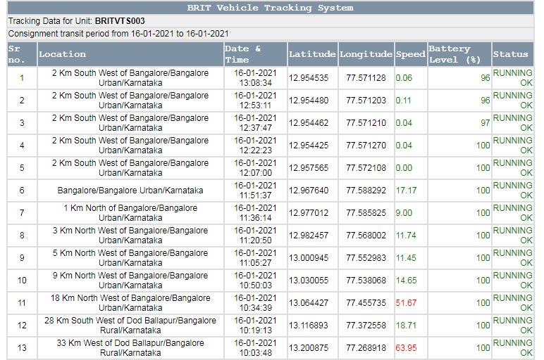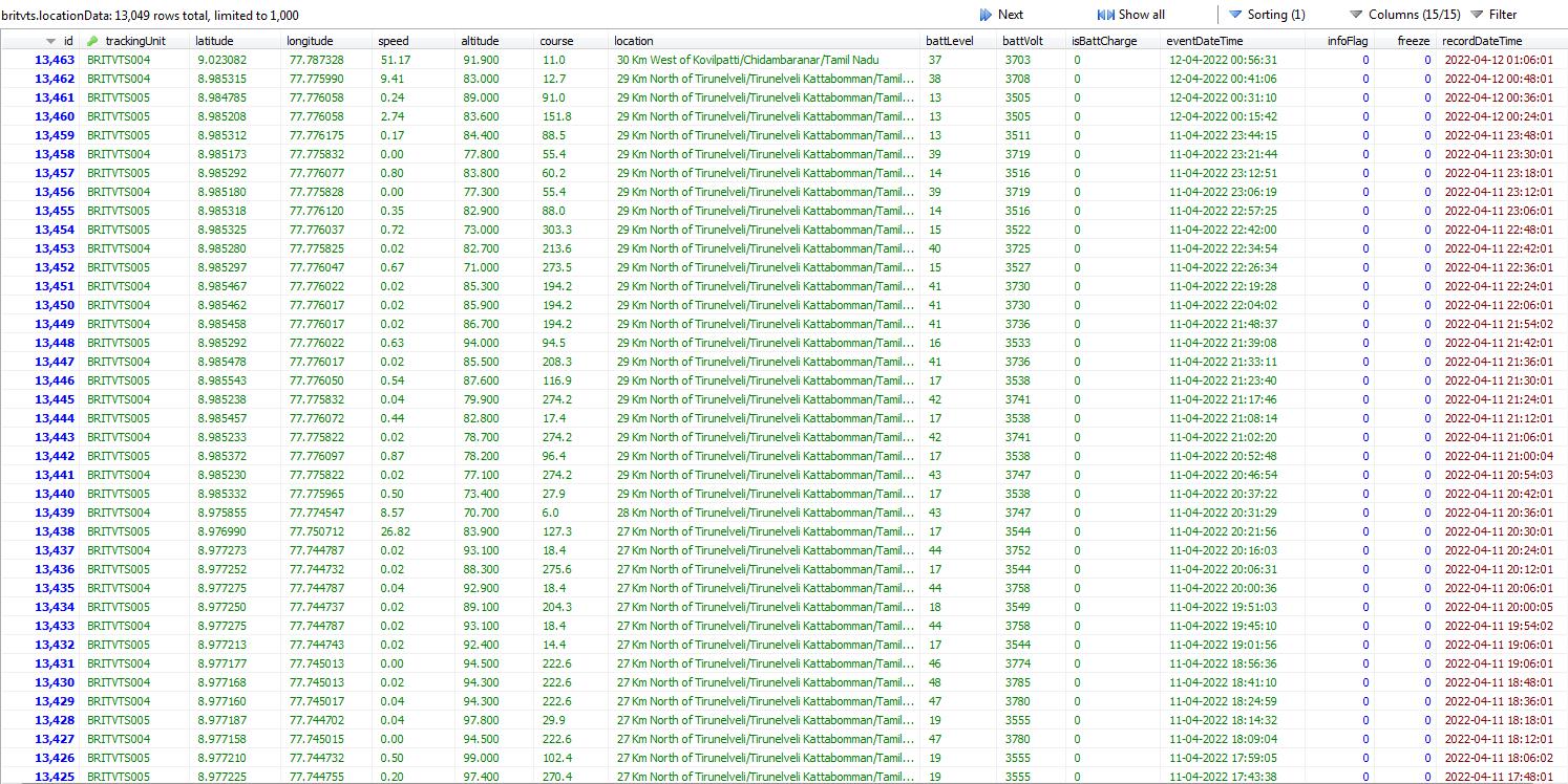 The receiving station consists of a GSM modem attached to a Linux based server system that reads a device ID, location message,statusetc.andextractsthelocationandstatusdatafromthemessageandthenstoresthedatainadatabase.Every GPSunithasbeenassignedwithaspecificIDe.g.BRITVTS00xandeveryIDhasaSIMnumberassociatedwithit.SotheIDand SIMnumberoftheunitismatchedwiththedetailsstoredinserverdatabasethen onlythelocationdata isverifiedtobe original.ThereisalsoscopeofuniqueIMEIverificationofaGSMunitmoduleandmaybeimplementedinfuture.Fig.6shows datastorage.