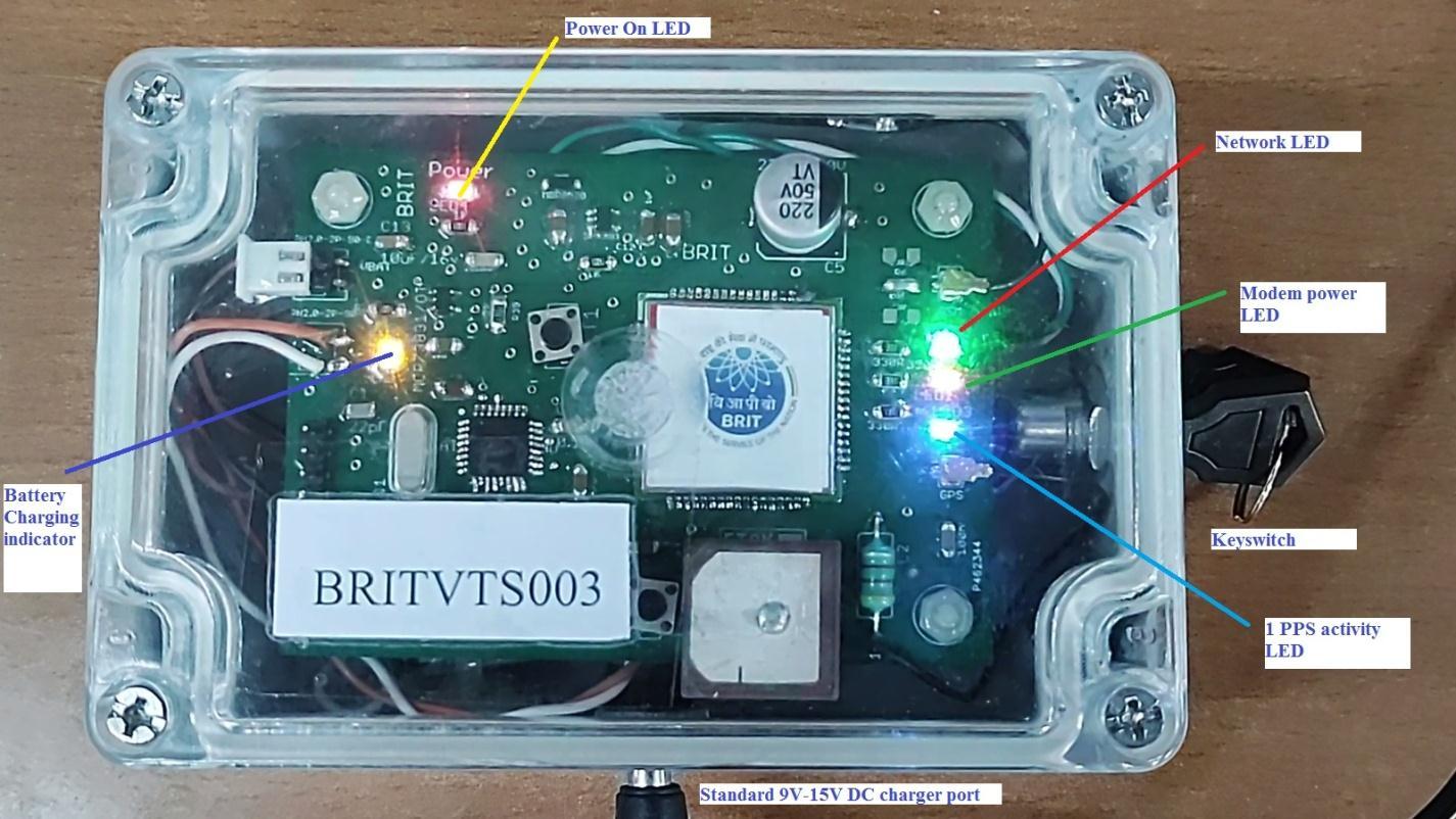 AccordingtoFig.4wherethefamiliaritytotheindicationLEDsareprovided,itcanbeseenthatRedLEDisforpoweron indication.TheorangeLEDistheBatterychargeindicatorwhentheunitisbeingchargedwithDCadaptor.Thebatterycharges attherateof500mA.Theoreticallyfora5000mAhbatteryitwouldtakeminimum10hrstocharge.Afterchargingiscompleted theOrangeLEDwouldshutoff.Orwhicheverisearlier.ThegreennetworkLEDblinkscontinuouslywhenevertheunitsearches forGSMnetworkinthevicinity.Onceitfetchesthenetworkthenitblinksonceinevery3seconds.TheYellowLEDindicates theGlonass/GPS/GSMmodulepowerandtheBlueLEDthatblinksevery1secondindicatesmodemactivity.