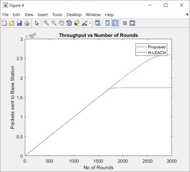This graph shows the throughput of the network under boththeschemes.Theproposedschemehashighervalue ofthroughputsincethenetworkwasliveformorenumber ofrounds,somorenumberofpacketsweretransmittedto the base station. The number of packets sent to base stationwas259435withtheproposedscheme.Withthe Existingscheme,throughputis174727whichmeanstotal no. of packets received by base station is174727 when network was simulated for existing scheme. Basically, nodesaregettingdeadlatelyinproposedschemedueto whichmorepacketsarereceivedbybasestation.