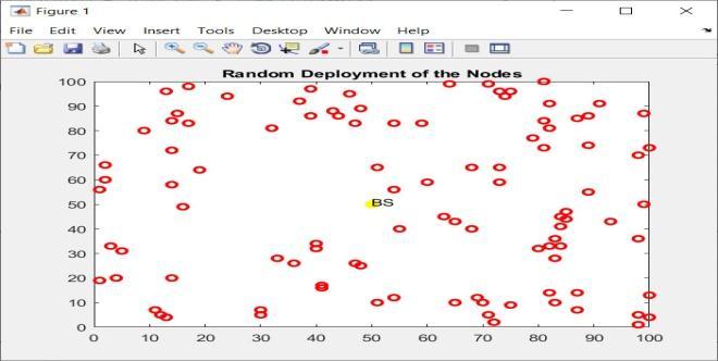 Theabovefigureshowsthenodesrandomlydeployedin thenetwork.Thenodesaredeployedintheregionof100* 100sqmeters.Thebasestationislocationat50,50.These nodes generate the random number and forms cluster head.