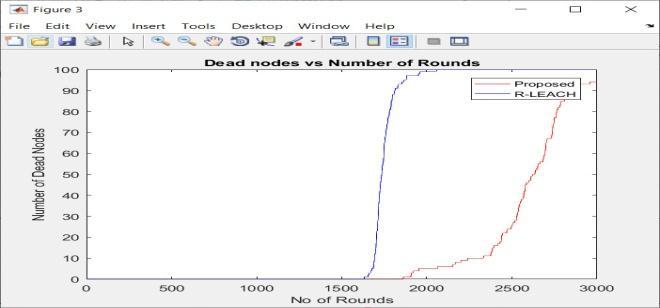 This graph shows the number of nodes dead in the networkagainstnumberofroundsforboththeschemes. Thefirstnodeofnetworkundertheexistingschemegot deadattheendof1633roundandlastnodegotdeadat theendof2056round.whereaswiththeproposedscheme, The first node of network got dead at the end of 1861 round. In the proposed scheme 6 nodes are alive after simulation of 3000 rounds that indicates network is not fullydead.