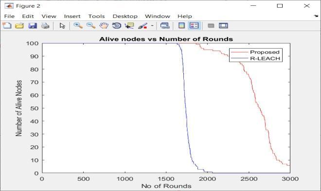Thisgraphshowsthenumberofnodesaliveinthenetwork against number of rounds for both the schemes. This indicatesbetternetworklifetime.Clusterheadselectionin theproposedschemeisbasedonfireflyalgorithminwhich fitnessfunctionofthenodeiscomputeddependingupon energy and distance of the node with respect to base station.Therefore,performanceintheproposedschemeis betterthanexistingscheme.