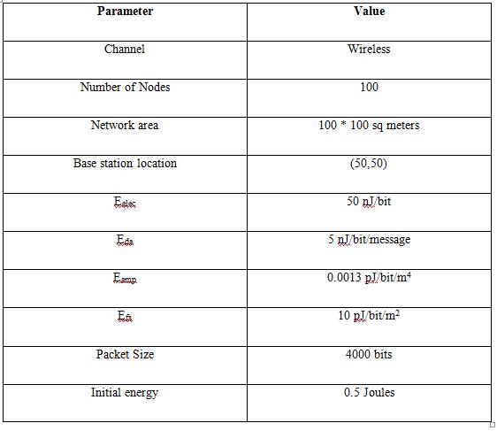 The proposed work as well as existing work were simulated in MATLAB. The simulation was conducted in network area of 100 sq meters and a total of 100 nodes were randomly deployed in the network. The various simulationparametersusedforthesimulationaregivenin thetablebelow: