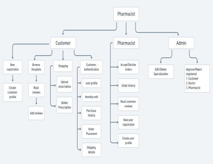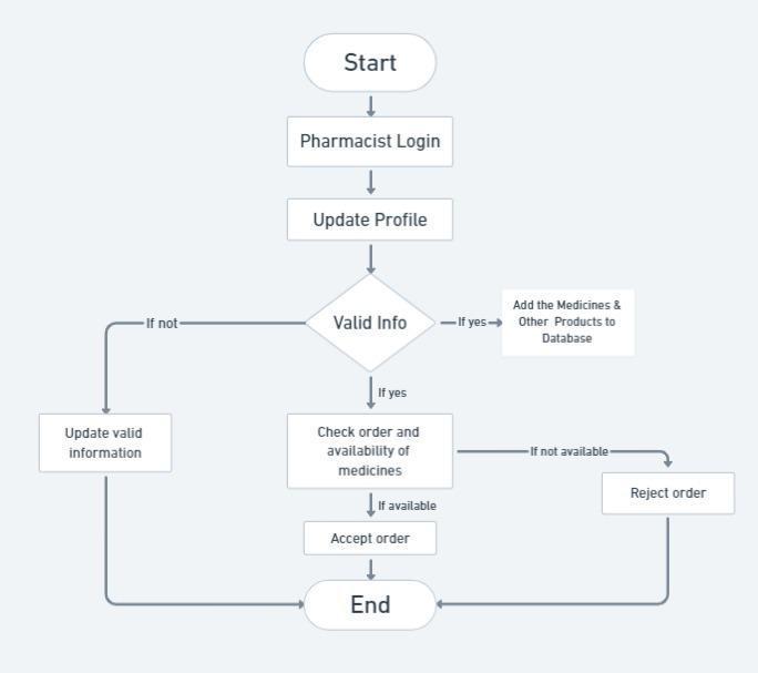 A list of the drugs offered in his medical shop will be uploaded by the pharmacist. He will get the prescription aswellasthedeliveryaddressforthemedications.During registration, he must show proof of his identity as well as thelicenseforhismedicalshop.