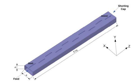 Onebroadwallhas10ellipticalslotswithaslot lengthof0.98mm.Oneendofthewaveguideis shorted,whiletheotherisfed.