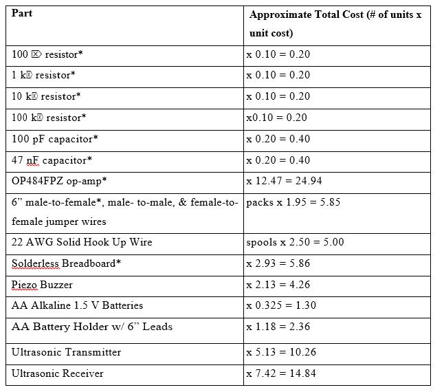Table: Kit Approximate part and cost