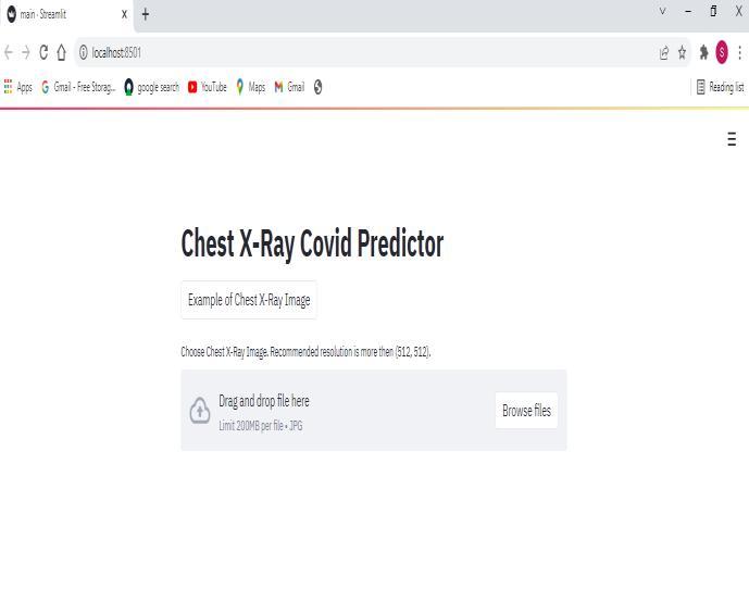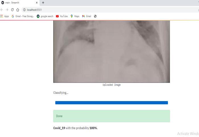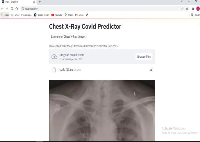 This section describes the implementation and scan resultsof X rayimagespredictingcovid 19.Inthissection a user has to input the chest X ray image, the predicator then predicts whether the patients is covid19 positive or covid19 negative. This predictor is also capable of classifying the chest x ray images along with the percentage.