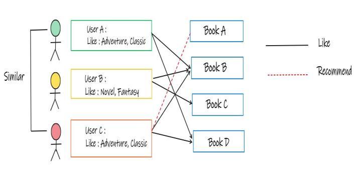 User A prefers book genres A, B, C, and user C prefers to read books B, D, hence we can conclude thatthelikingsof userAanduserCareverysimilar.SinceuserAlikesbookD aswell,wecandeducethattheuserAmayalsolikebookD, therefore bookD would be recommended to the user The general idea of the algorithm is based on a review of previous ratings provided by the users. Find the neighbor userasalphawhoexhibitssimilarinterestwithtargetuser beta,andthensuggeststhe items which the neighbor user alpha preferred to target user beta, the predicted score whichthetargetuseramaygiveontheitemisobtained by thescorecalculationofneighboruseralphaontheitem.