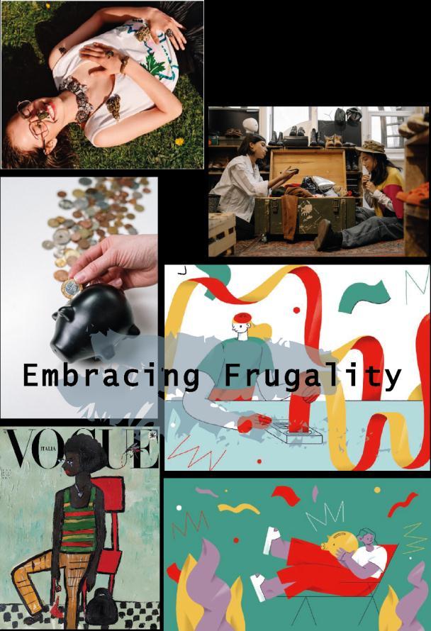 Embracing frugality: Duringpandemicmanyhave faced financial crisis and spend more on hospital bills so afterthepandemicmostpeoplearoundtheworldwillsearch for organic, nature based or frugal fashion. The frugal fashion were the garments are sustainably produced and followsversatilityinalowprice.Peoplewillstarttospend more on only the most needed things like minimalism. So hereversatilityisfollowedbyme.Thistrendisgoingtobea majortrendin2023whichisforecastedbyWGSN.Herethe trendisallaboutembracingthefrugaleconomywhichwill befollowedbymanymajorbrands.