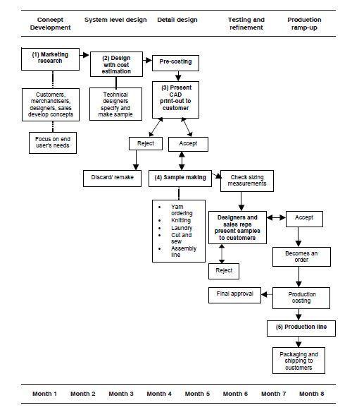 They developed a process model based on their insights from one U.S. knitwear company. The model was common to most of the companies and they analysed and refinedtheprocess.Theirproductdevelopmentprocessis illustratedbelow.