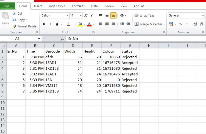 As shown in Fig 5, work pieces will be sorted in two areas.workpiecewhichmatchesselectedsortparameters itgetspassedofanyparameterdoesnotmatchesitwillbe rejected. It shows Excel sheet where result is stored. ResultconsistsofJob number,DateandTimeofchecking,