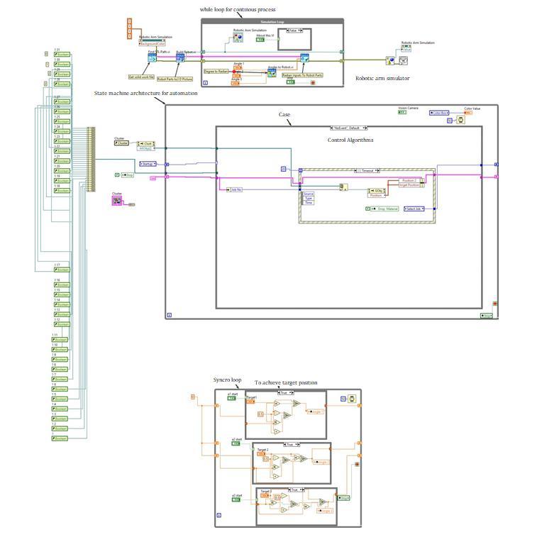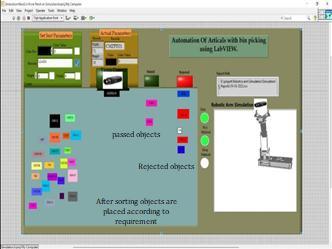 Solving this task required collaborative effort from several industrialist in order to create a functional bin picking system with automation of sorting materials according to its Height, Width, Color, Barcode, which required building and connecting various hardware and software components. Our commitment to this project was simulating the ‘brain’ of this system, which is the simulation of visual recognition system, and simulating the behavior of the robotic arm. In this project, the developed components are described, implemented and tested.