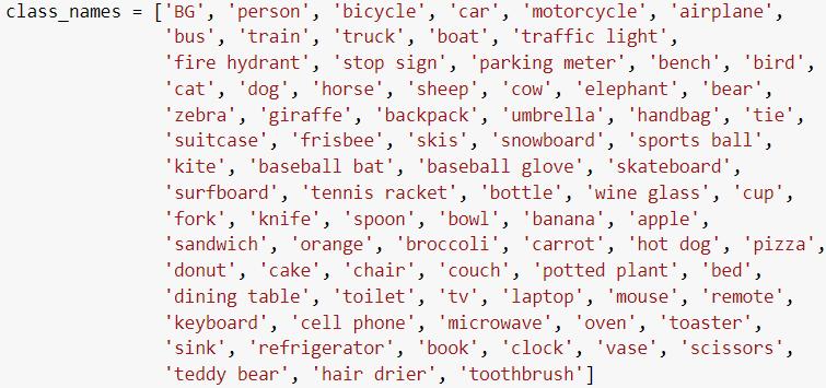 Next, we created our model and loaded the pretrained weights.Themodelispre trainedontheCOCOdataset.This dataset includes overall 80 classes (plus one background class)thatyoucandetectandsegmentfromaninputimage (with the first class being the background class). We then definedtheclassesoftheCOCOdatasetwhichwillassistus inthepredictionphase.