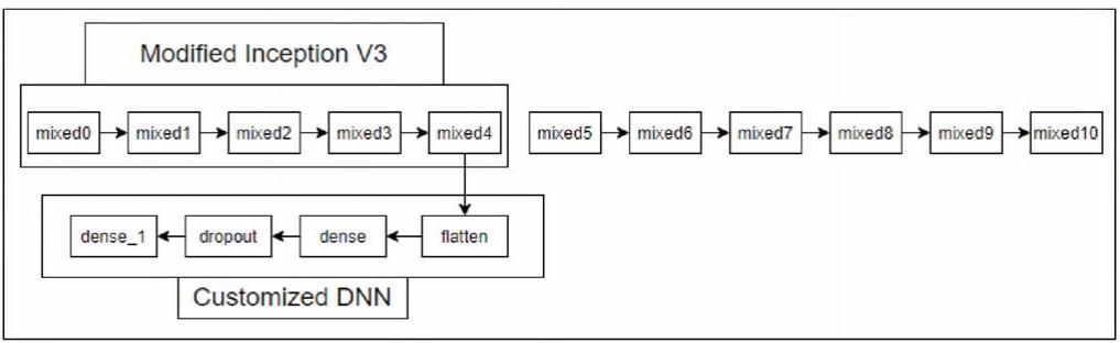 Themodel'sfinallayerswerereplacedwithaDNNthat extracted the output using four customized layers, flatten to convert the mixed layer output to a one dimensional array, and a dense layer of 1024 layers. The following layerwasutilizedtodropout20%oftheneurons.Finally, a dense 1 layer with sigmoid activation function of 1 neuronwasemployed[13].