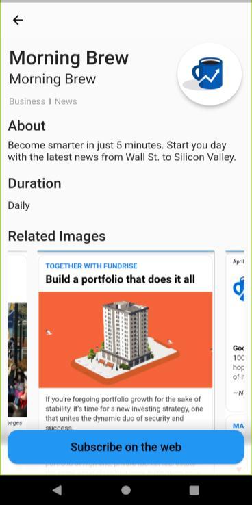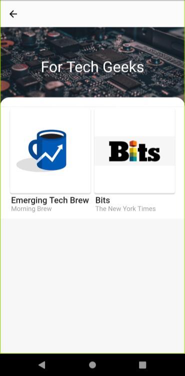 Alongwiththeinboxwhereusercanreadandsharenewsletters,theappalsoconsistsofanexplorepagethatgetsdynamically updatedasperthedatastoredinthedatabase.Theexplorepagecontainstopcuratednewsletters,withpopularnewslettersof differentgernes.Thishelpsusertofindthebestcontentoftheirlikingandsavestimeascomparedtosurfingthrougharticles andvideosfornewrecommendations.Allthenewslettersarestoredinfirebasereal timedatabase. Eachnewsletterinthestore containsabriefdescriptionofit,alongwithsampleimagesandthefrequencyofpublishing.Alongwiththis,adirectlinktothe subscription page is provided, to make the whole process more efficient. Once the user registers for the newsletter, the applicationasksiftheuserwanttoaddsthisnewslettertothecurrentlist.