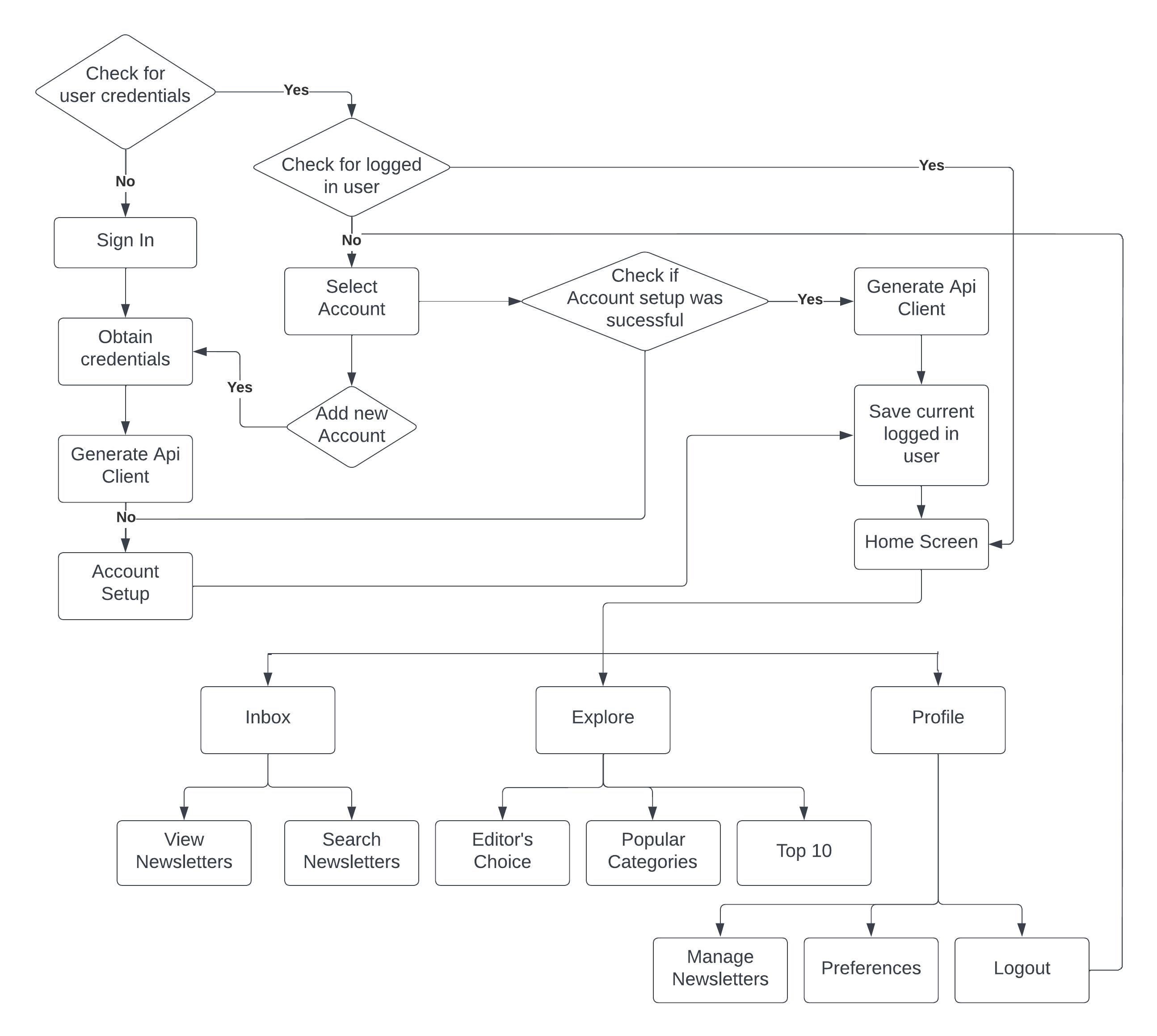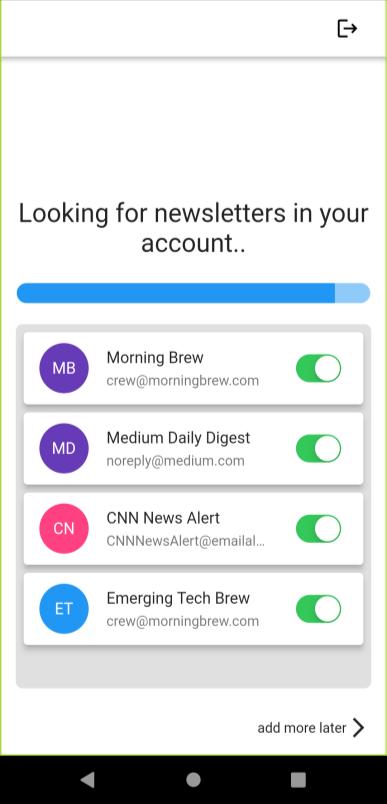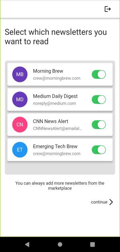 Oncesuccessfullyloggedin,theuserwillberedirectedfortheaccountsetup,theappchecksfornewslettersinyouremailsfrom last14days,theusercanthenselectwhichnewsletterstheywanttobeshownintheapplication,morenewsletterscanbeadded lateron.Afterthesetupiscompleted,theuseristakentotheHomeScreen.