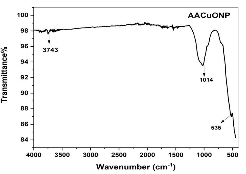 Absorbancebandsat3248,2127,1362,and752cm 1 wereobservedinthespectrumofAlbiziaAmaraleavesextract.Abroad bandat3248cm 1 wasduetotheO Hstretchingofalcoholcompounds.Thepeaksat1827and1363cm 1 areContaining NH2 groupandC=Ogroupsofflavonoids[26 27].775cm 1 iscontainingC Hbonds.FTIRspectrumofCuONPforthepeakappeared at 3393, 1632, 1015, 709, and 562 cm 1. The peaks at 3393, 1632 and 1015 cm 1 corresponding to hydroxyl group ( OH) Stretching, hydroxyl ( OH) bending and C O stretching respectively. The Narrow bands at 535 confirm the formation of CuONPs.