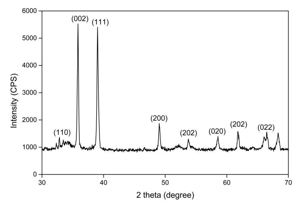Fig (3) Shows the appearance of diffraction pattern at 2θ= 33.3, 35.4, 38.8, 48.7, 58.3, 61.8, 66.28 and 68.0 which are assigned to the planes (110), (022), (111), (200), (202), (020), (202), (022) respectively of monoclinic phase CuONPs. No characteristic peak due to any impurity was observed in the diffraction grams Suggesting the formation of pure crystalline CuO.Theaveragesize ofthe CuOwascalculatedbyusingtheDebye SchererEquation(3)[25].Asharppeak at20=35.4and 38.8withthediffractionofthe(022)and(111)planeindicatesthatconfirmationofCuONPs.Theaveragecrystallitesizeinthe samplesofCuONPsisbelow21nm.