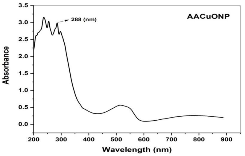 Fig 3. Shows the UV Vis absorption spectrum of copper oxide nanoparticle. The adsorption spectrum was recorded for the sample in the range of 200 800 nm. The spectrum showed the absorbance peak at 288 nm corresponding to the characteristicbandofcopperoxidenanoparticle[24].