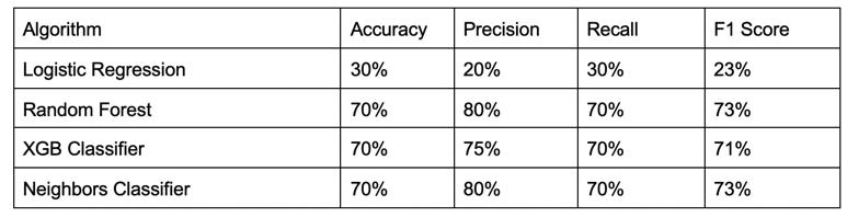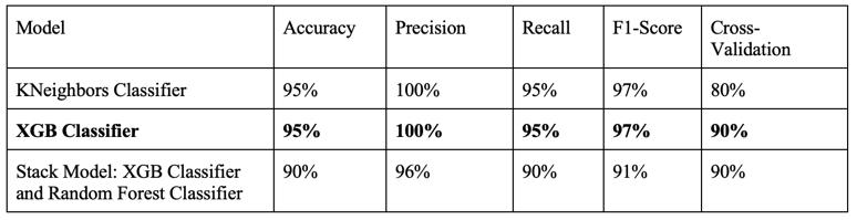 From the Table, it can be clearly seen that all models performsimilarlyinthefourbasicmetricsused.So,cross validation is used to check the model performance in a different split of data. Among all the classifiers, XGB Classifierperformsthebest.