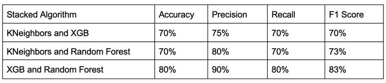 From the above table, it can be clearly seen that the stackedXGBandRandomForestperformthebest.