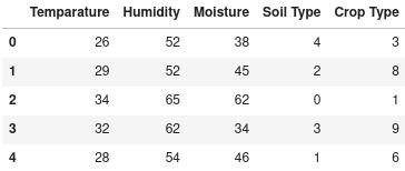 TableforTemperature,Humidity,Moisture,andSoilType isusedasfeatures.CropTypeisthetargetLabel.
