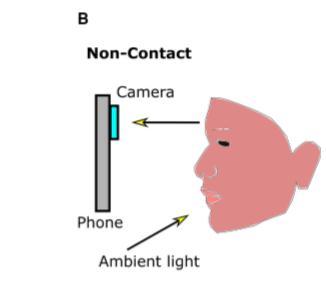 (B) Non contact method Ambient light reflected from the face is used in non contact procedures. The video is then processed to improve the signal to noise ratio of the hemoglobin signal, which is then sent into a machine learningalgorithmtodeterminebloodpressure(similarto contact methods). PTT [2] can be computed using only a