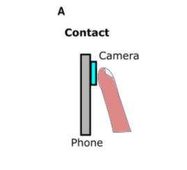 (A) Contact methods To obtain a finger blood volume pulse, you must touch your finger against the phone camera. Each frame averages the pixels in the video. A waveform as a function of time can be created by further processingandfilteringthesignal.TocomputeBP,features from the waveform are collected and fed into machine learning algorithms. The pulse transit time (PTT) can be linked to blood pressure (BP) [2], although many sensors arenecessary.