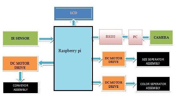 For evaluating utilizing best option camera position is changed so that for catching live picture of an organic product the camera is ceaselessly checking the transport line in video mode, when transport stops as organic product is identified by IR framework camera can catch topviewpictureoforganic product.Thedark foundation tone in picture is more straightforward to remove the natural product edge characters later [1] so dark tone is utilized for the transport framework. The caught picture is given as a contribution to the MATLAB programming whichseparates(identifies)shadingandsizeofanatural product, this information is moved to ARM based framework byutilizingRS232andcomportandlikewise control move is made spot, later transport starts and afterward natural product is gathered in fundamental plate of evaluating get together. In the event that natural product is red tone (as identified by MATLAB) the principle plate is moving anticlockwise and in like manner the natural product is gathered in lower plate 1, presently relying upon the size of fruit(as distinguished by MATLAB) it tends to be reviewed as a little or huge organicproduct.Assumingorganicproductisofhugesize thelowerplate1willbemovinganticlockwiseandonthe off chance that organic product is of little size the lower plate 1 will be moving clockwise, Similarly, in the event thatorganicproductisofgreentone(asdistinguishedby MATLAB) the principle plate is moving clockwise and appropriately the organic product is gathered in lower plate2,presentlyrelyinguponthesizeoforganicproduct (as identified by MATLAB) it tends to be reviewed as a little or huge organic product. Assuming that organic product is of enormous size the lower plate 2 will be moving anticlockwise and in the event that organic product is of huge size the lower plate 2 will move clockwise