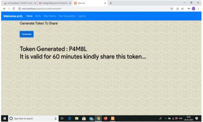 TheTokenisgeneratedfortheverificationpurpose,whenanycorporateoranyotheruserisidentifyingourdocuments.The Token is generated for 30 minutes and the company can only identify user document, they don’t have any access for the deletionandupdationofanydocuments.Fig.6.showstheTokengeneratedforverifyingcertificate.