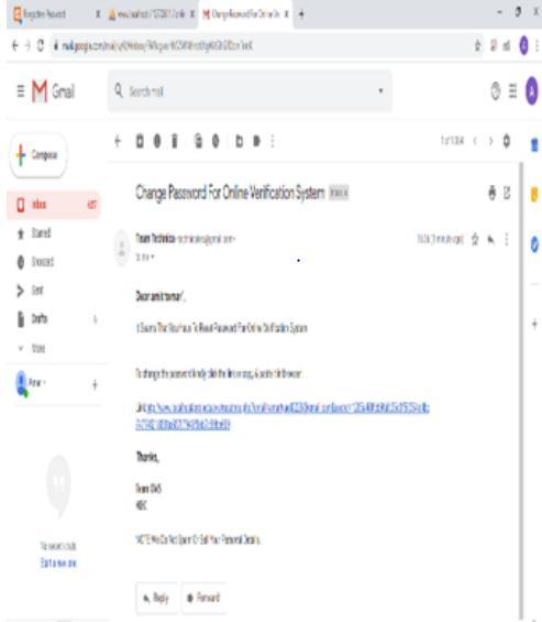 Thisinterfacewillpopupwhenuserclicksthe“forgottenpassword”link.Theverificationlinkforthepasswordchangewill be senttotheregisteredemailid,theusercanchangethepasswordfromthelink.Fig4.andFig.5displaytheusernotificationand verificationlinktochangethepassword.