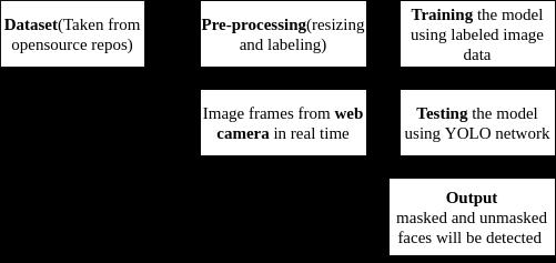 For the effective face mask detection application, we are using YOLOv3 which is the efficient one, and commonly used for the real time object detection systems. As compared to other available techniques this one is faster andaccurate.YOLOconsistsof53layerswhicharetrained withImageNet.Forourspecificapplicationwearestacking 53 more layers, which combinedly gives 106 layers which wecan use for our application of face mask detection. For training the model the required dataset is obtained from the internet. Various data formats such as png, Jpeg are includedinthedataset.Therearelotsofdatasetsavailable including Kaggle’s dataset for Face Mask Detection by Omkar Gaurav. All the photos were from open source resources, out of which some resemble real world scenarios, and others were artificially created to put a maskontheface.