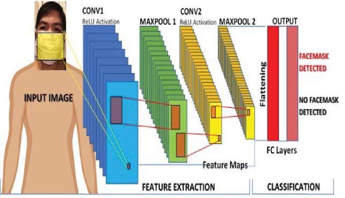 Facecanbediscoveredinbothstaticimagesandreal time video streams using this face detection algorithm. Overall, thismodelisquick,preciseandresource efficient.Nowthe model has been trained, it can be used to detect the existence of masks in any image. The given image is initiallyfedintoafacedetectionmodel,whichdetectsallof thefacesinit.Subsequently,thesefacesareintegratedinto an CNN based face mask detection algorithm. The model wouldidentifythehidden patterns/features ofthepicture andcategorizeitas"Mask"or"NoMask."