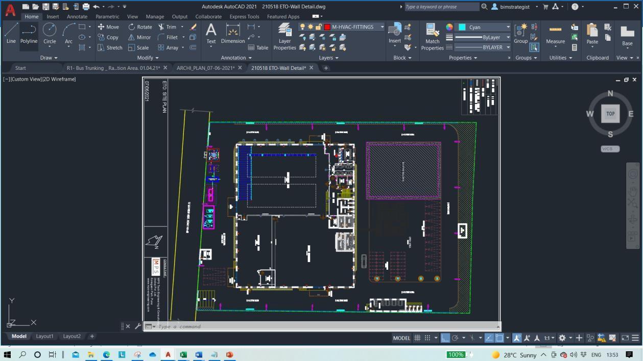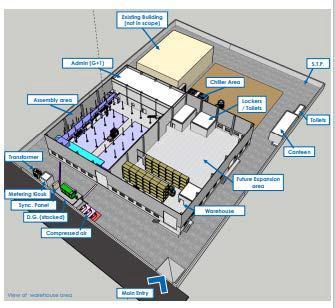 To determine the applications and benefits of BIM, the industrial shade, at Dodballapur industrial area in north Bangalore shed project was chosen. Having mezzanine floorforofficeusage,and1shedhas2partswithdifferent temperature one is ambient, and one is 18 degrees centigrade. The facility getting used for automobile parts manufacturing for German automobile company. Building has planned and constructed with using 3d model and Constructiondocumentationwasextractedfrom3dmodel and other details regarding the construction project are providedbelow. 4.1